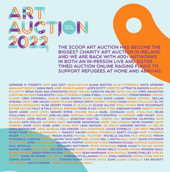 After hosting the event online for the last two years, we are delighted to announce that our biggest annual fundraiser – The SCOOP Art Auction is back with a one-day live auction and a separate live virtual auction in April. The live auction takes place at The Iveagh Garden Hotel in Dublin. In April 2021, we sold over 400 artworks at the auction and offered to split the hammer with the artists.